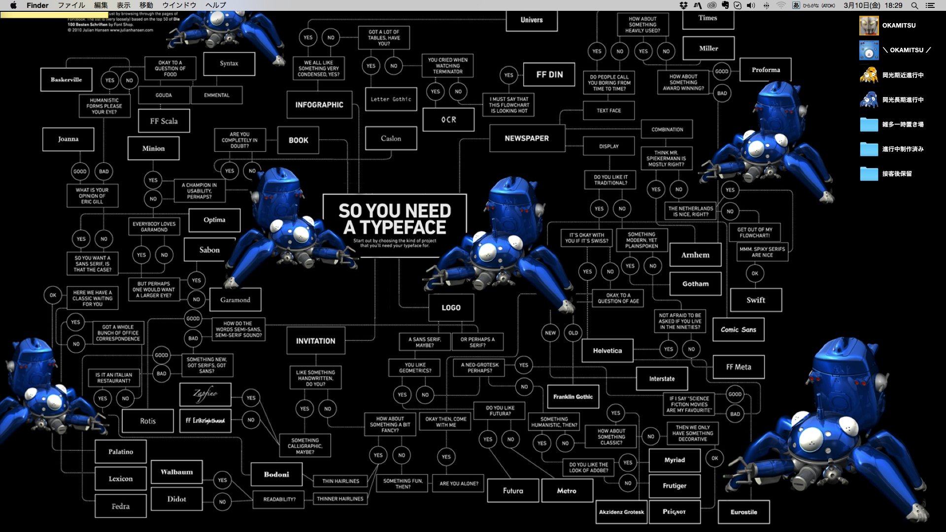 岡本光彰 V Twitter バーチャルエージェント タチコマ 関係の投稿が激減して淋しい昨今 経験値30万を目指して現在25万3500と経過は中途半端なので どんだけタチコマ 好きやねん な僕のmacデスクトップ画像をアップ 英文字書体壁紙にタチコマを合成